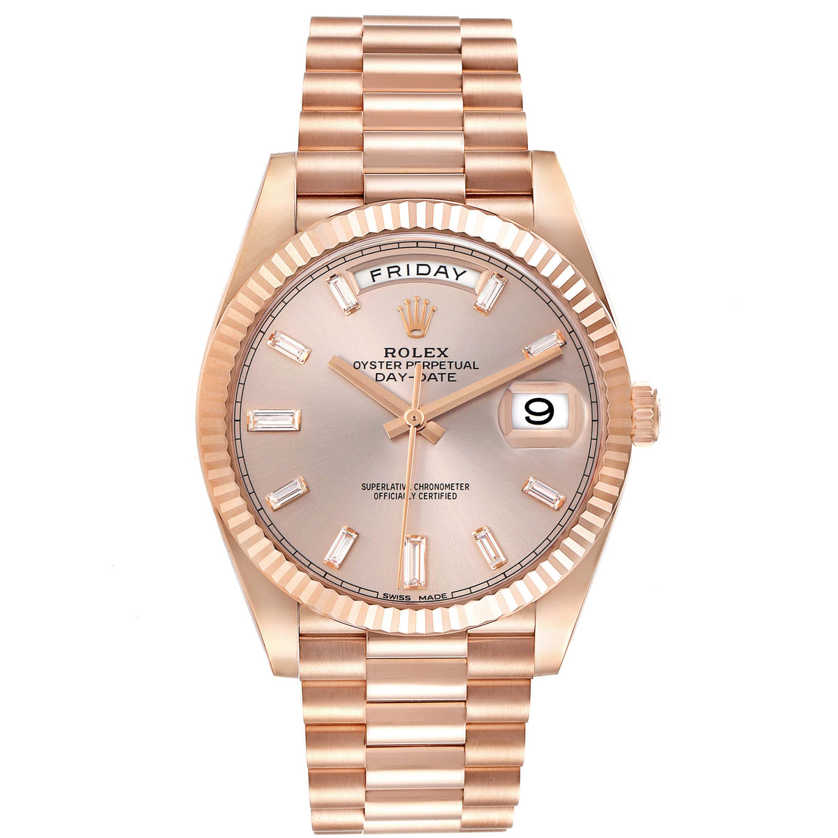 ROLEX DAY-DATE 40MM ROSE GOLD 228235 | SUNDUST DIAMOND DIAL | FLUTED BEZEL| PRESIDENT BAND |
