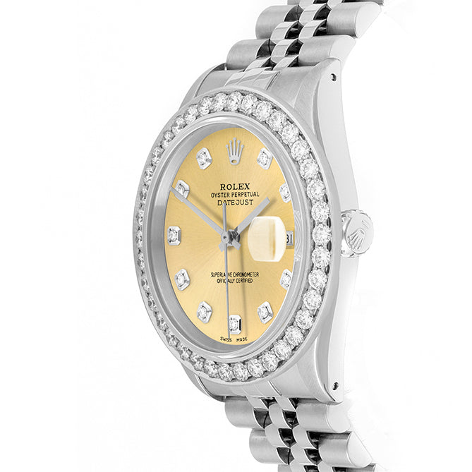 Rolex Datejust 36mm STAINLESS STEEL 16234 Champagne Dial | Diamond Hour Markers | 2.5 ct Diamond Bezel